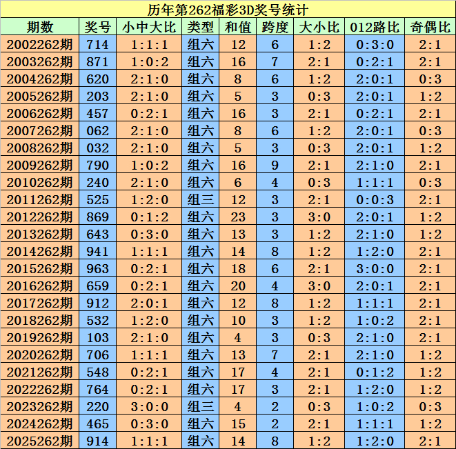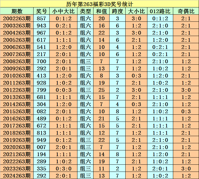 在积年同时开奖中,组三出现7次,组六开出16次,前年同时为组三,本期戒备组三重迭出现。